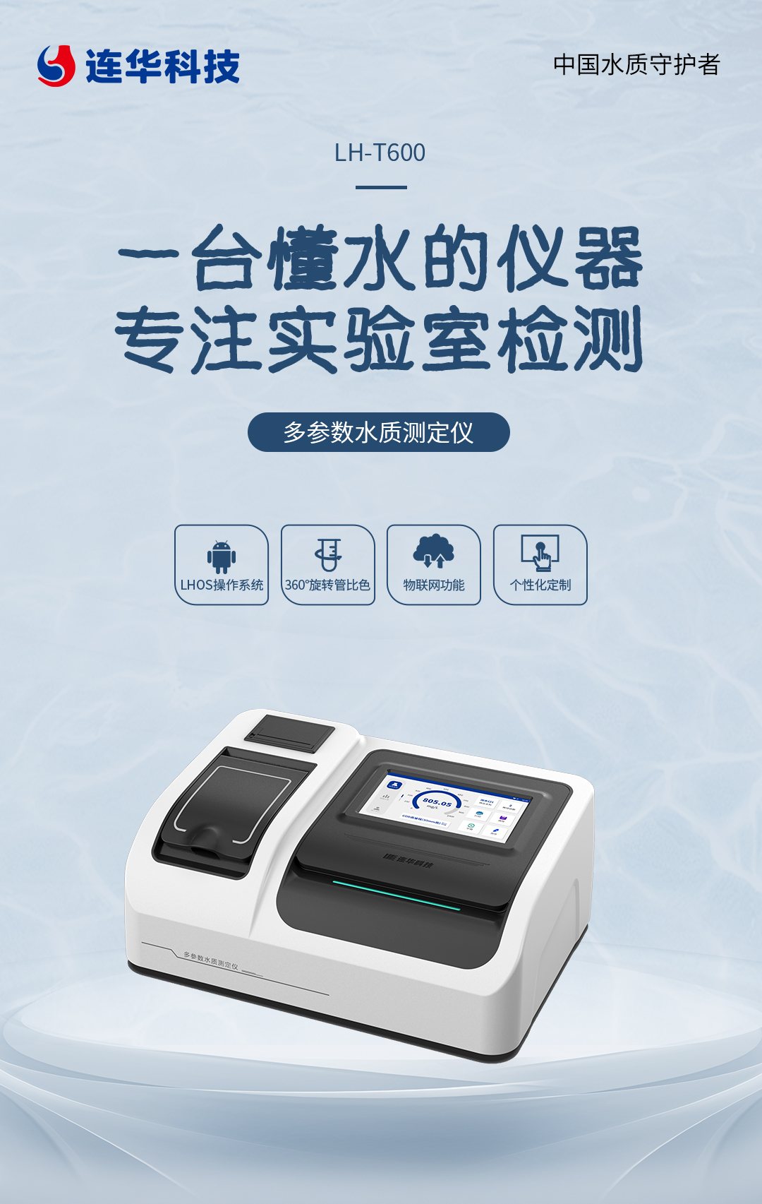 連華科技清瀾系列LH-T600多參數(shù)水質(zhì)測定儀,專注于實驗室水質(zhì)檢測,其卓越的多指標檢測能力、創(chuàng)新的LHO操作系統(tǒng)、靈活的指標個性化定制及強大的物聯(lián)網(wǎng)功能,不僅符合國家行業(yè)相關(guān)標準,更是實驗室水質(zhì)檢測領(lǐng)域的全能選手。