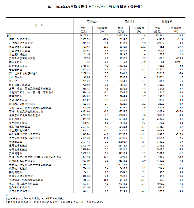 1—9月份,采礦業(yè)實現(xiàn)利潤總額8963.8億元,同比下降10.7%;制造業(yè)實現(xiàn)利潤總額37325.0億元,下降3.8%;電力、熱力、燃氣及水生產(chǎn)和供應業(yè)實現(xiàn)利潤總額5992.9億元,增長12.1%。