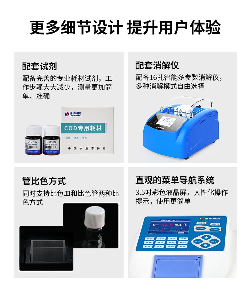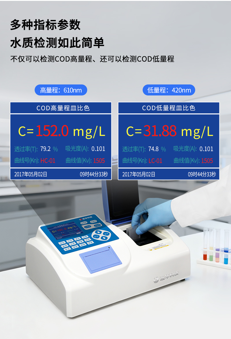 簡要描述: 儀器依據(jù)《水質(zhì)化學(xué)需氧量的測定快速消解分光光度法(HJ/T399-2007)》標(biāo)準(zhǔn)設(shè)計,采用雙光路無干涉系統(tǒng),可以測定COD高量程、COD低量程水樣,同時支持皿比色與管比色兩種比色方式,便于用戶選擇合適的耗材進(jìn)行實(shí)驗(yàn),具有極高的便利性和性價比。